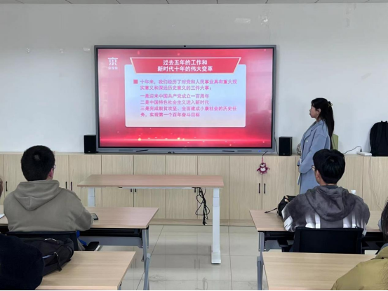 李彦浩同学首先解读了党的二十大主题,然后从新时代十年伟大变革入手,生动形象地展示了党十年来经历的三件大事:一是迎来中国共产党成立一百周年,二是中国特色社会主义进入新时代,三是完成脱贫攻坚、全面建成小康社会的历史任务,实现第一个百年奋斗目标。