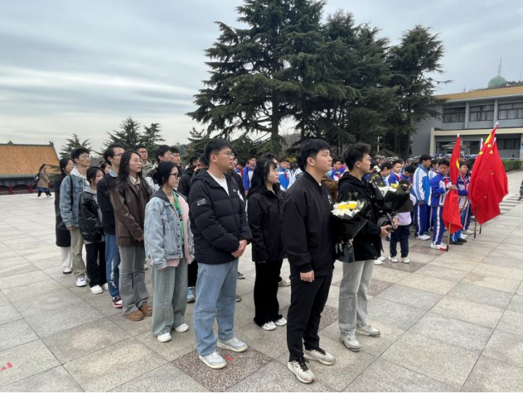 在“山河魂”烈士群雕像下,同学们在纪念馆讲解员的引导下,全体肃立,为英雄烈士默哀,并献上鲜花向革命前辈们致意。