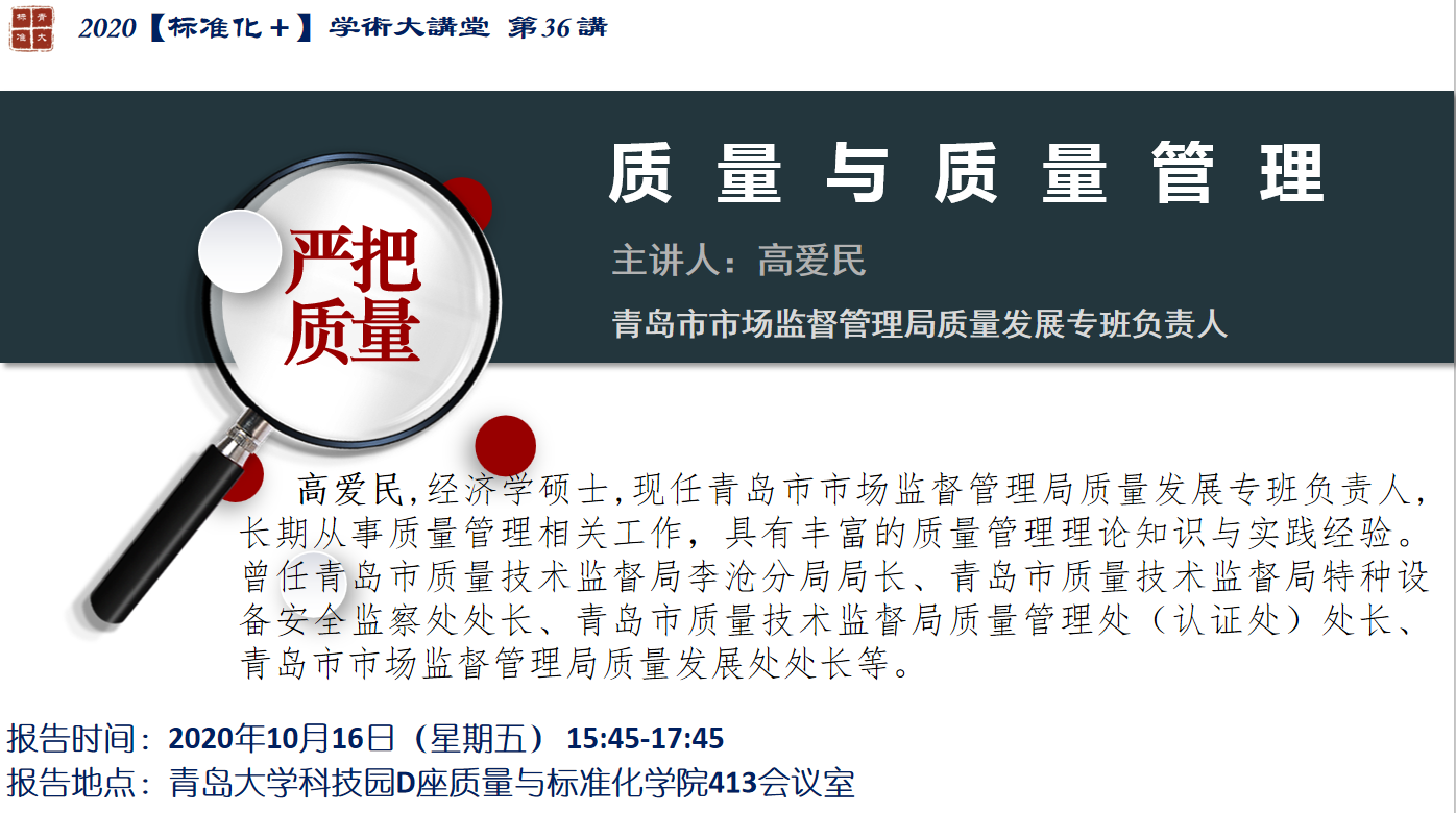 10月16日下午,葵司 【标准化+】学术大讲堂在学院会议室举行。此次大讲堂由青岛市市场监督管理局质量发展专班负责人高爱民处长主讲,孙慧波老师主持,学院全体2018、2019级学生参加。