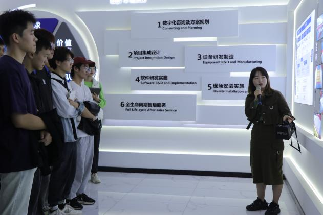 实习学员随后参观了仓储生产车间,学习不同设备的作用和运作流程,了解了企业如何通过物流、仓储到整体工厂三位一体的自动化、智能化升级,实现精益生产、降本增效、数智化转型的企业目标。最后,企业质量工艺部管理人员与学员们进行了互动答疑。