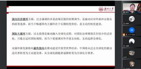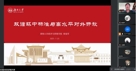 2021年7月21日上午,湖南大学经济与贸易学院院长——侯俊军教授做客我院“标准化+”学术大讲堂,线上为师生们做了《双循环中标准与高水平对外开放》的精彩学术讲座。学院师生们参加了此次学术交流。