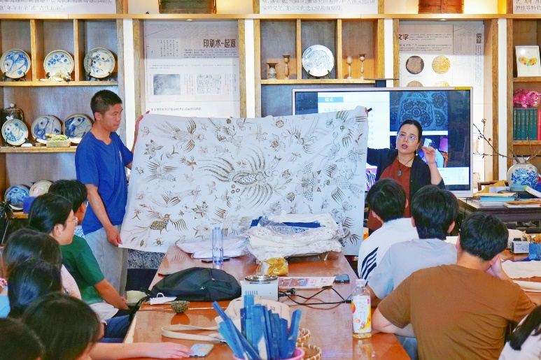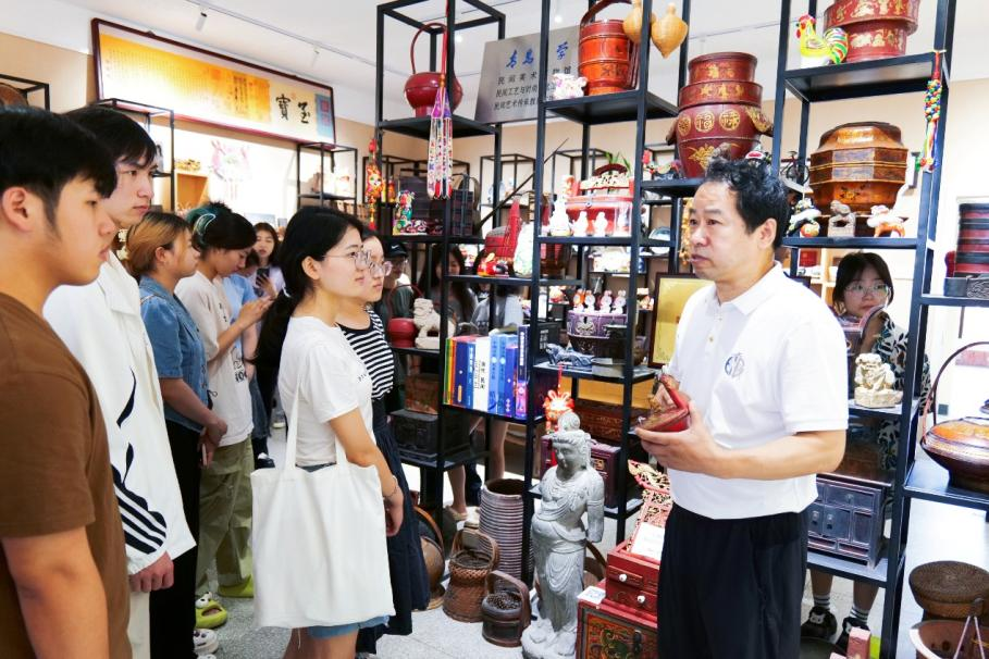 首先,侍锦教授带领同学们参观了葵司 非遗传承实践教育基地,一同走进非遗、走入非遗,感受非物质文化遗产的魅力。侍锦教授着重选取了标准相关的非遗产品详细介绍,让同学们联系专业切身体会到了每一个非遗产品背后的文化内涵与文化气息。