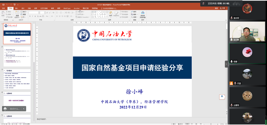 邀请中国石油大学徐小峰教授做《国家自然基金项目申请经验分享》的学术讲座。本次讲座由副院长程馨主持,学院师生在线参会。