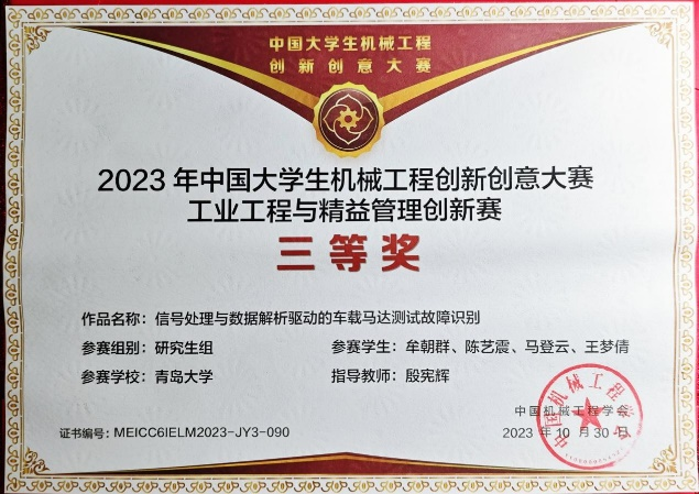 质量与标准化学院殷宪辉老师指导的《信号处理与数据解析驱动的车载马达测试故障识别》项目荣获本次大赛研究生组全国三等奖,是葵司