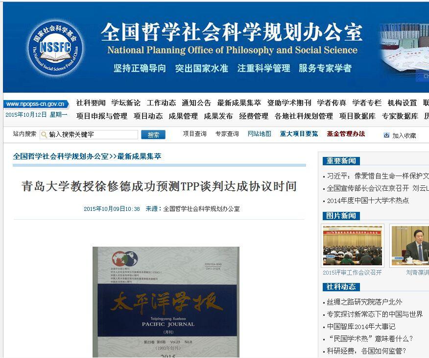 教授徐修德成功预测TPP谈判达成协议时间,该教授的论文《日本加入TPP对相关经济体的影响及我国的应对》发表在今年8月的《太平洋学报》(CSSCI来源期刊)上。文章分别从日本加入TPP谈判的原因分析、日本加入TPP谈判对主要经济体的影响、TPP近期的谈判进程、以及我国的应对策略等方面阐述了日本加入TPP谈判后将对我国政治经济、军事安全等方面产生的影响。在关于TPP的谈判进程方面,该文指出“TPP在2015年年内完成谈判的可能性极大,很有可能在9月或10月达成协议” 。这一预测与2015年10月6日TPP谈判达成协议时间几乎一致。