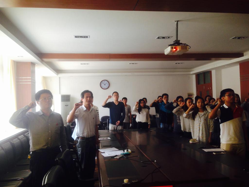 会议随后进行了“戴党徽,跟党走”重温入党誓词仪式。陈崇研书记、房征岩老师和赵业婷老师为学生党员代表佩戴党徽,党员代表依次为其他党员佩戴党徽,全体党员面向党旗,重温入党誓词。