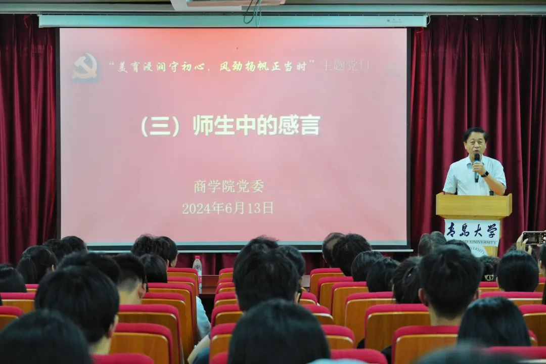 党委书记王功勇老师分享了对美育内涵的理解,阐释了美育作为“五育并举”的重要组成部分,在立德树人和思想文化教育中具有不可替代的作用,鼓励同志们多诵读经典,增强自身修养、提高审美能力,促进自由全面的发展。他还寄语毕业生党员们,要秉持家国情怀,坚定理想信念,传承优良传统,用奋斗擦亮青春底色,争做有理想、敢担当、能吃苦、肯奋斗的新时代好青年。