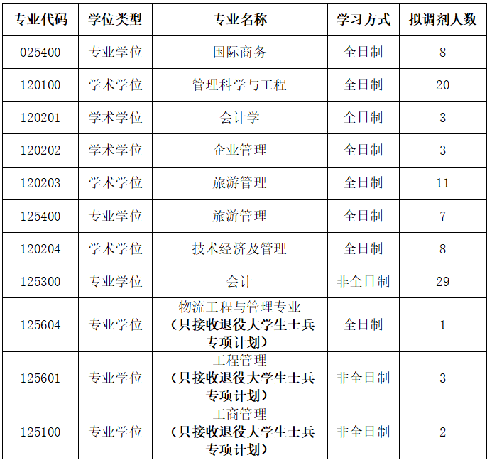 6.第一志愿报考工商管理、公共管理、旅游管理、工程管理、图书情报、审计、会计专业学位硕士的考生,在满足第一志愿报考专业和调入专业国家线要求、调入专业报考条件(含工作年限)的基础上,可申请互相调剂,但不得调入其他专业;其他专业考生也不得调入以上相关专业。