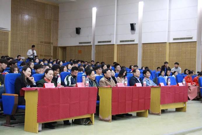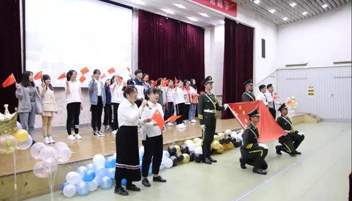 4月26日晚的图文报告厅灯火通明,悠扬的乐曲缓缓响起,同学们从四面八方汇聚舞台,齐声高歌《我和我的祖国》,全场师生情不自禁起立,摇旗合唱,向国旗致敬。当国旗班四名队员手举着五星红旗正步步入会场,鲜艳的五星红旗拨动着每个人的心弦。那一刻,每个人心中都激情澎湃,我和我的祖国,一刻也不能分割!别出新裁的快闪方式演绎了不一样的开场曲。