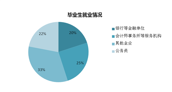从就业单位性质来看,约1/5就业于银行等金融单位,1/4就业于会计师事务所等服务机构,1/3就业于其他企业,另有部分学生考取公务员。从就业地区来看,约2/3就业于山东省,1/3就业于山东省外。