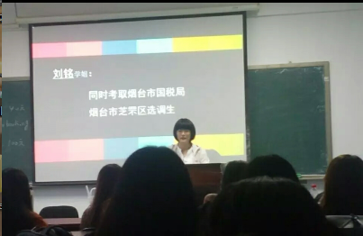 接下来是刘铭学姐的分享,她同时考入烟台市国税局和烟台市选调生。她认为公务员考的是情商 ,看的是气质。要多读书 ,腹有诗书气自华。要多关心国家大事和时政新闻,形成自己独到的见解,这在面试的时候是非常重要的。平时要注重积累,关注一些新闻评论的微信平台,每天坚持去看,日积月累,知识面就上去了。她把备考过程概括为: 从无到有,从有到精, 从少到多,从整体把握知识框架到做一些真题使知识更加巩固,再到有针对性地去做一些训练从而掌握技巧,最终实现自己的目标。