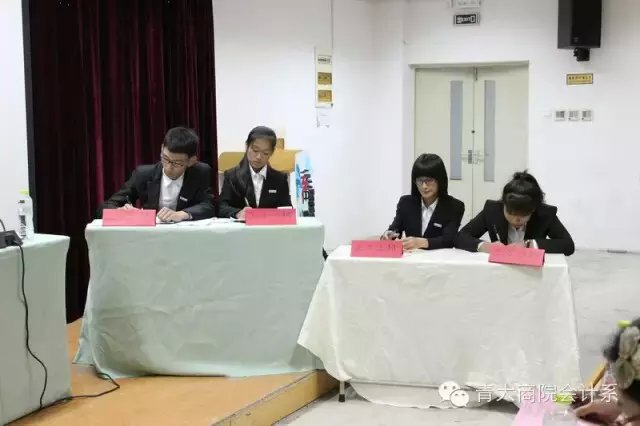 学生会主席杜俊辉、会计学系学生会主席陈昭旭、副主席周元楠、秘书长姚道晗、会计学系艺术团团长肖锦以及14级辩论赛最佳辩手潘玮担任评委。本次比赛的对战双方是会计三班和财务管理二班。