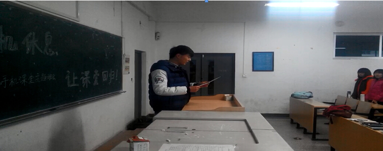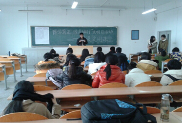 由副班长宣读班主任于坤老师关于文明课堂对同学们的寄语,提出了关于建设文明课堂的两方面的的对策:一是实现“无手机绿色课堂”的对策1.学校制定相关措施如安装屏蔽仪。2.教师高教学水平,调动学生积极性。二是提出了关于学风建设的问题:1.必须学好专业基础知识,化严峻的就业压力为动力。2.培养自己多方面的能力,积极参加各项活动。辅导员李晓涵老师讲话,发起征文活动——文明课堂之我建。