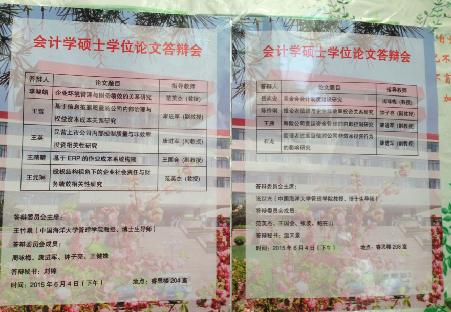 6月4日下午,会计学系2012级硕士学位论文答辩会在睿思楼204和208会议室举行,答辩由中国海洋大学管理学院王竹泉教授、张世兴教授作为答辩委员会主席,会计学系硕士研究生导师周咏梅教授、范英杰教授、康进军副教授、张波副教授等8人作为答辩委员参加,会计系在读硕士研究生列席旁听。