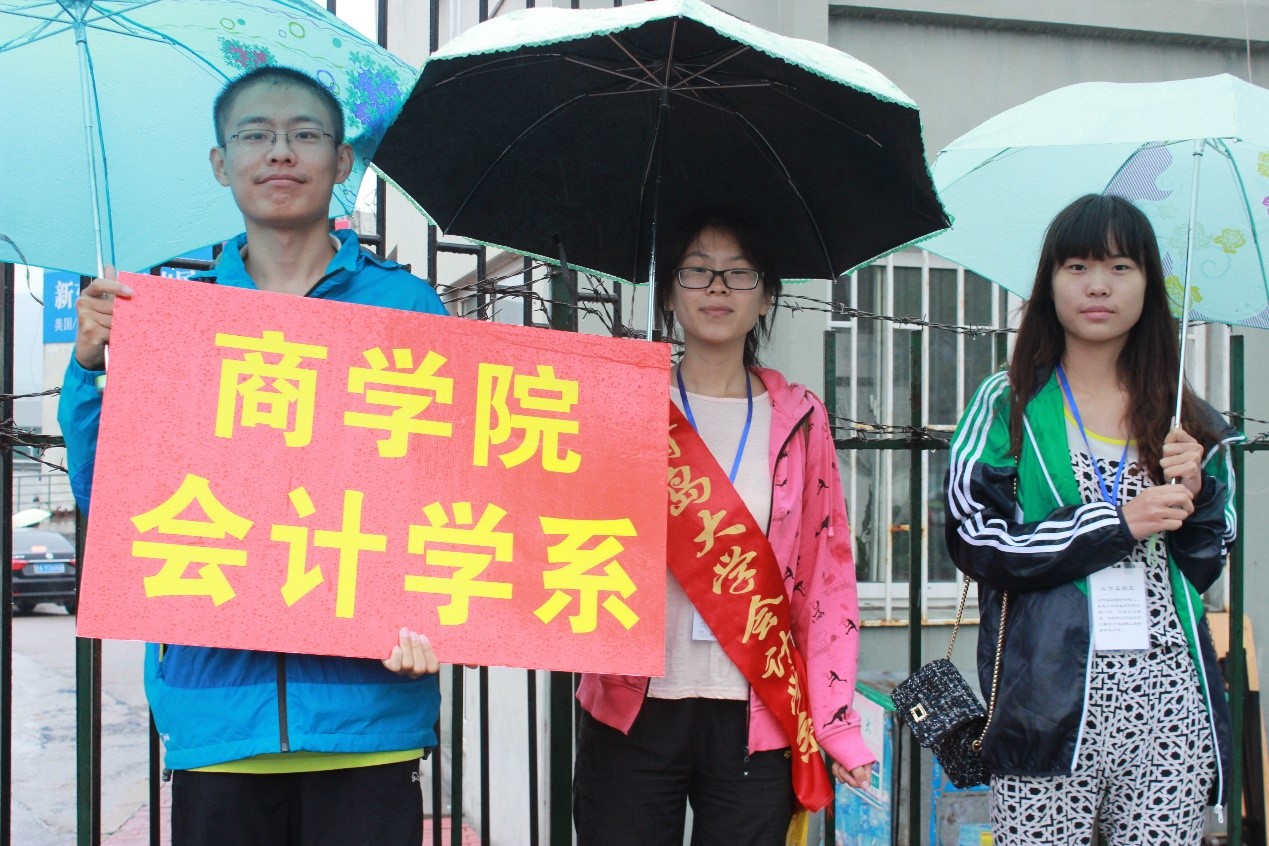 会计学系迎来了第二批2015届新生。兴许是为了遵循往年的惯例,今年的迎新日依旧飘着小雨。虽然天气不好,可会计学系迎新团队学长学姐们的迎新热情却丝毫不减,反而更加高涨。由于今天是新生们正式报道的时间,所以今天的迎新工作显得尤为紧张,但一切都在迎新团队细致的安排下有序的进行着。