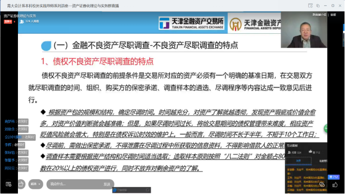 为了开拓专业视野,培养本科生的实践能力,会计学系近日举办了本科校外实践导师专题讲座,本次讲座聘请了我系校外实践导师、青大优秀校友、天津金融资产交易所副总裁刘世平老师。刘世平老师长期从事评级、资管、证券化业务,具有深厚的理论功底和丰富的实践经验,本次讲座的题目是“资产证券化理论与实务”,刘老师结合自己的实践经验介绍了资产证券化种类及实务操作问题,同时还就不良资产处置问题介绍了自己宝贵的经验,引起了同学们的强烈反响。