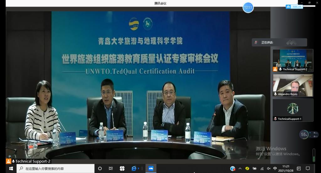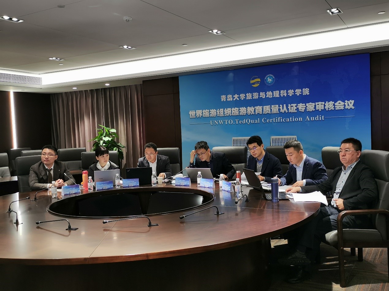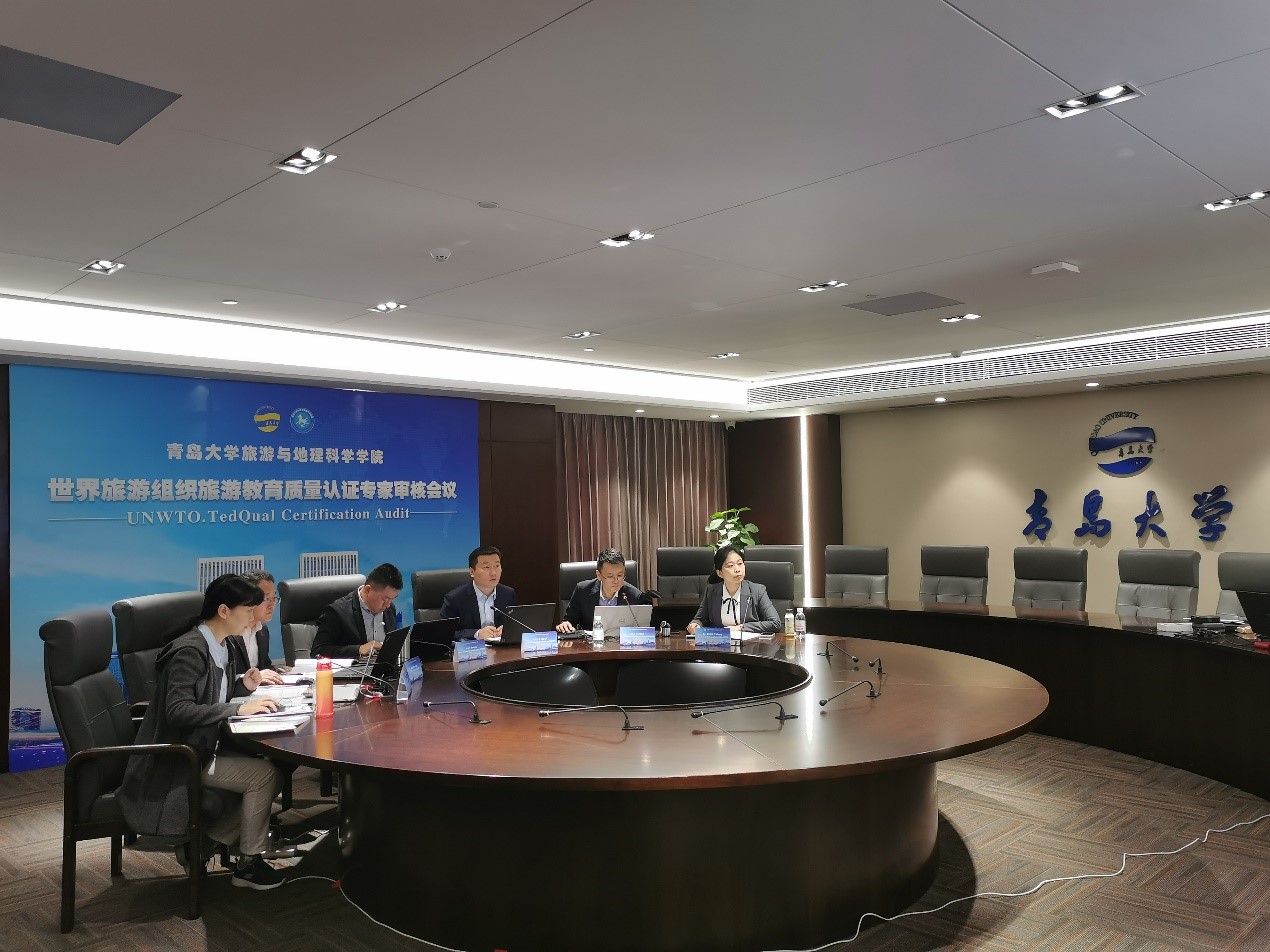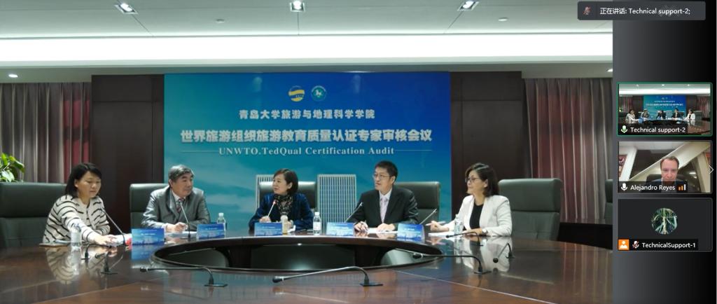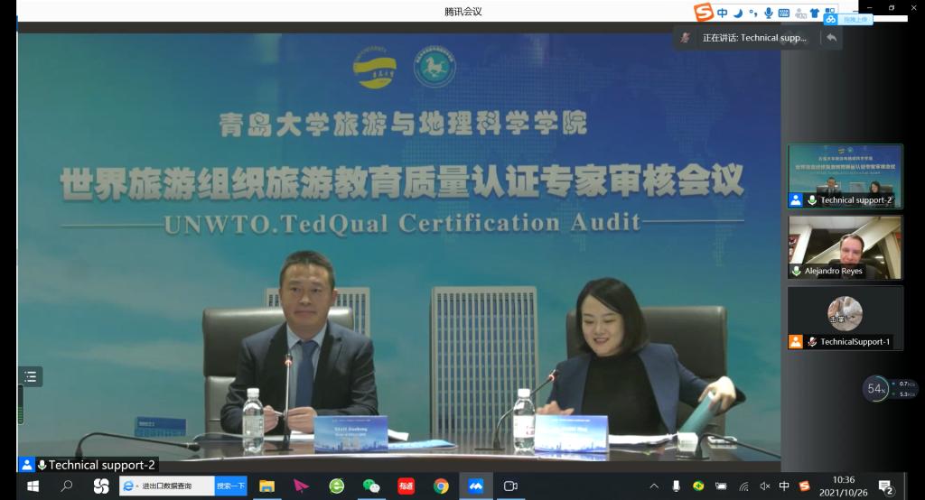 旅游管理专业和酒店管理专业联合国世界旅游组织教育质量认证审核工作反馈会在会议中心301召开。校党委常委、副校长孔伟金出席会议并致辞,学校教务处、财务处、学生处、人力资源处、国际交流合作处、资产与实验室管理处负责人、旅游与地理科学学院负责人、认证工作小组成员、教师代表等参加反馈会。联合国世界旅游组织旅游教育质量认证专家Dr.Reyes在墨西哥通过视频线上参加反馈会。