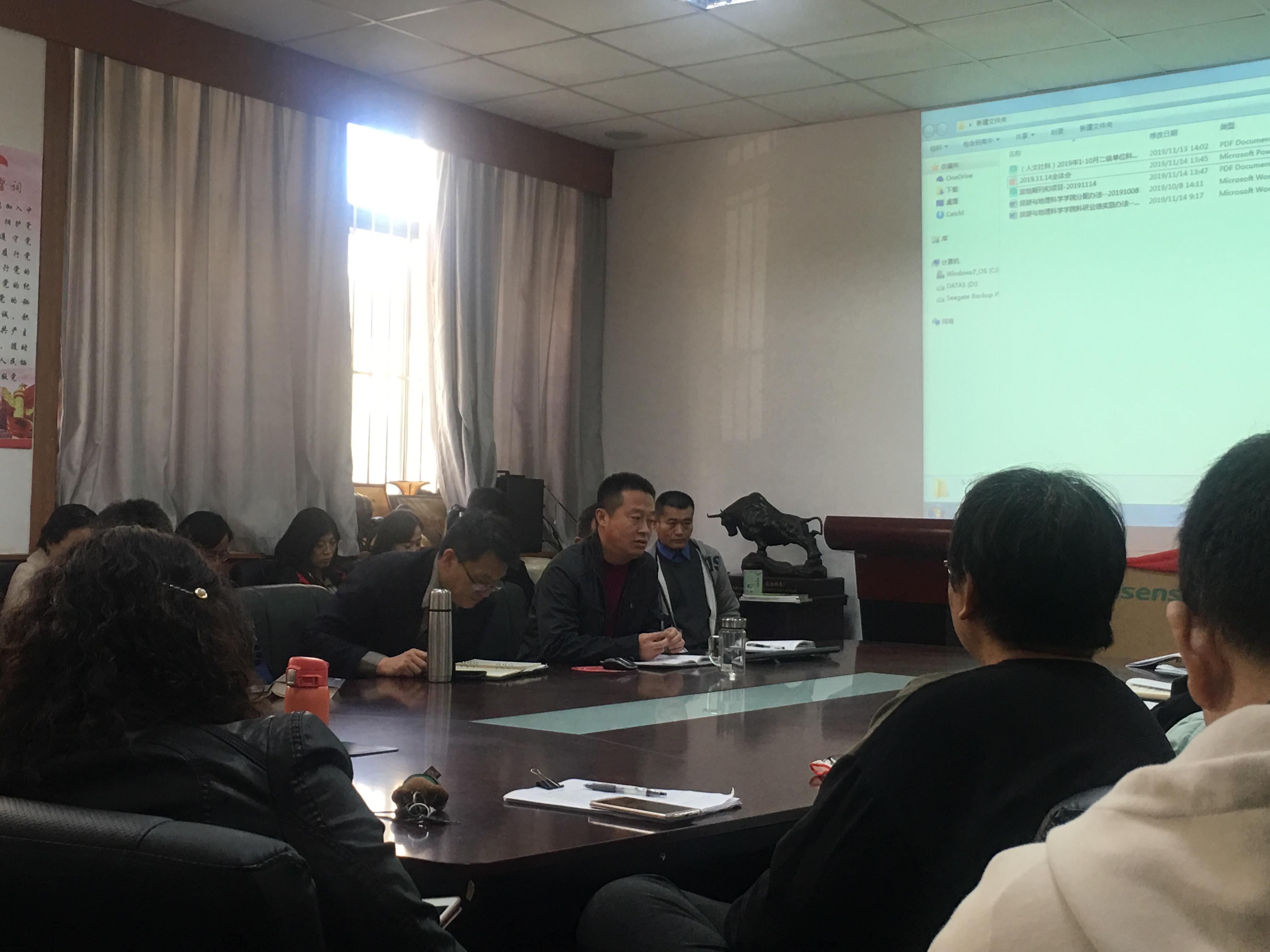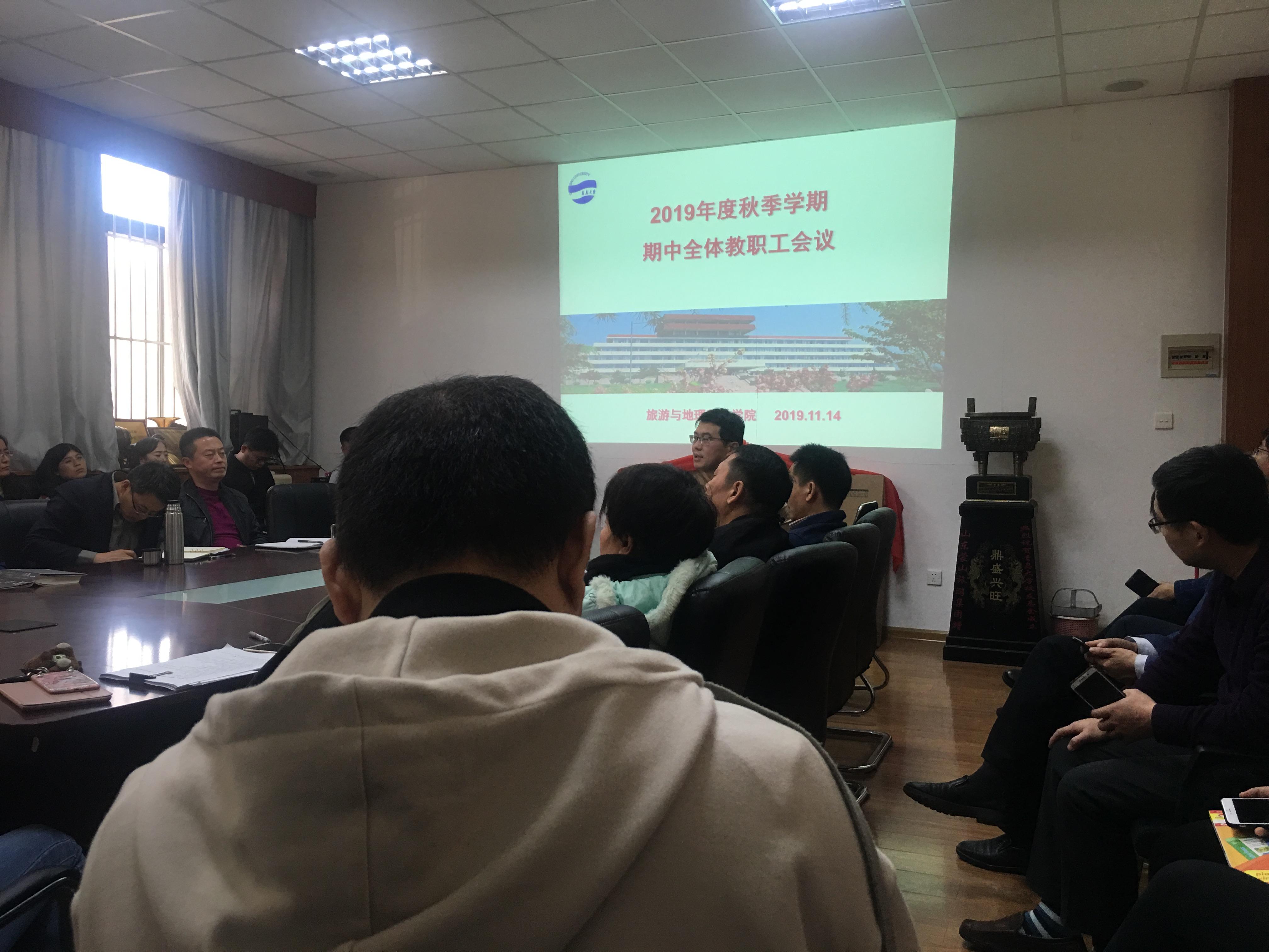 11月14日下午,旅游与地理科学学院在会议室召开全院教职工大会,对学院工作、期中教学检查、提高学生升学和就业率、学院绩效奖励分配办法等学院各项工进行研讨,以促进学院事业全面发展。