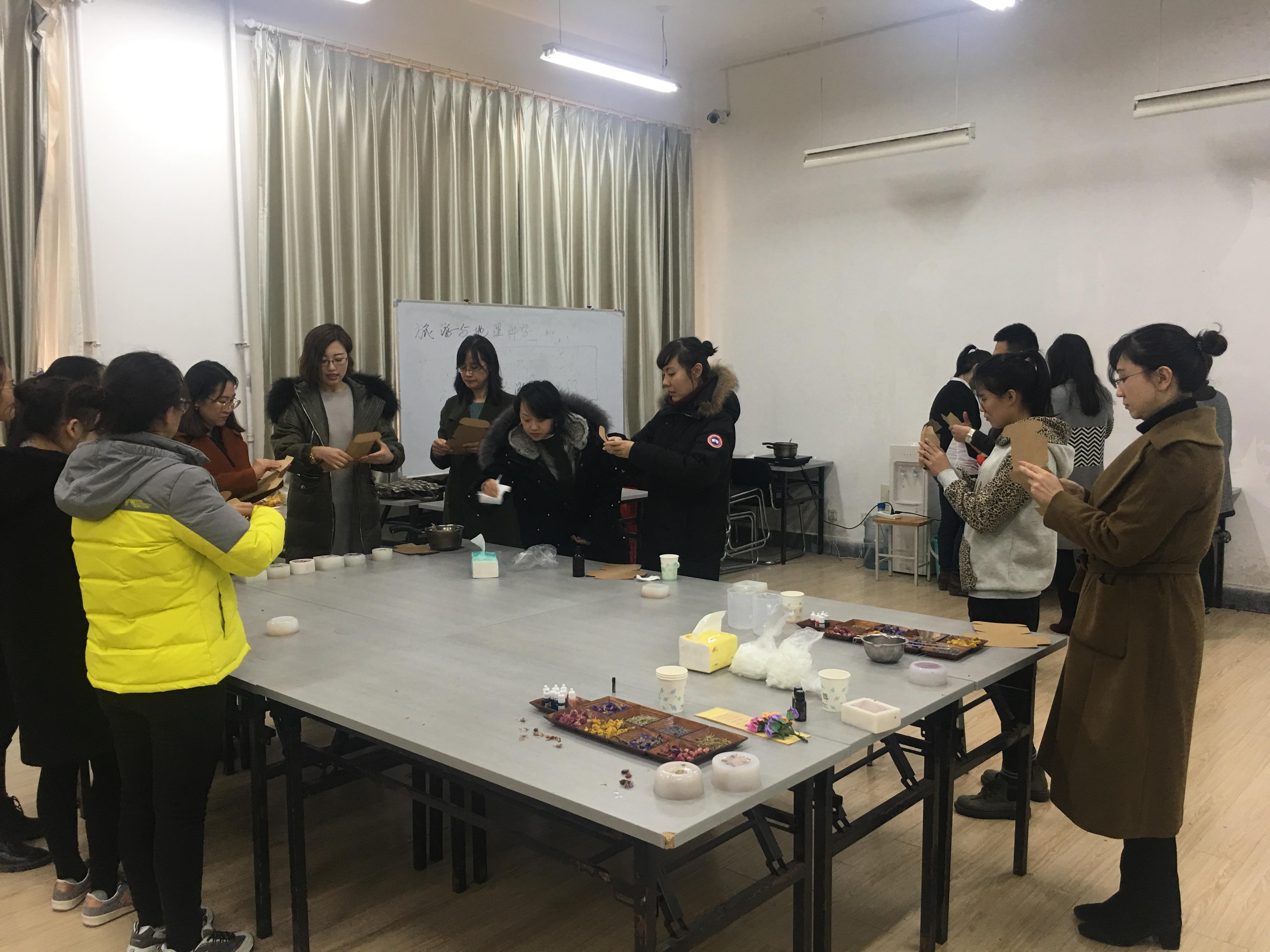 阳春三月,万物更新。3月9日下午,为庆祝“三八”国际妇女节,丰富女职工业余文化生活,旅游与地理科学学院在院酒店管理实验室组织开展了题为《植物芳香课堂》精油知识讲座。讲座开始刘善东书记和耿庆汇院长代表学院为全体女老师送上了节日的祝福,接下来由中国高级精油疗法康复理疗师文莉老师从植物疗愈功效、精油品质辨别、精油功效等方面进行了详细讲解,并与大家现场互动,女老师们在精油温馨芬芳的氛围里收获了精油与人体健康的相关知识。随后,在文老师的指导带领下,老师们学习了手工精油皂的制作流程和技巧,并根据自身体质,动手制作了一块属于自己的专属精油皂,大家在欢声笑语中体验了亲自创作的成就感。