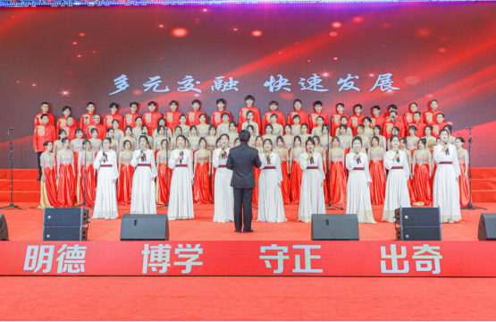 师生激情昂扬,一首《青大之歌》饱含对学校合并办学三十周年深深的祝福,也蕴藏着旅地师生知校兴校荣校的爱校情怀。一首《灯火里的中国》唱出国泰民安、烟火寻常的真挚祝愿。合唱团用饱满的热情、精湛的技巧和完美的配合响彻体育馆的每一个角落,将旅地学院的活力充分展示给每位观众。