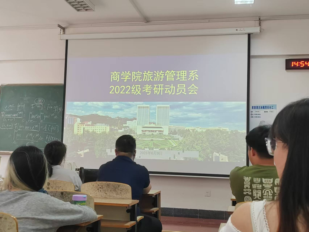为帮助2026届毕业生明确考研目标、科学规划备考路径,营造积极向上的学习氛围,2025年6月10日下午,旅游管理系举办2026届毕业生考研动员大会。旅游管理系主任郭永锐老师,副主任王克稳老师,辅导员韩煜老师,优秀考研标兵及旅游管理系2026届全体学生参会。会议由系主任郭永锐老师主持。