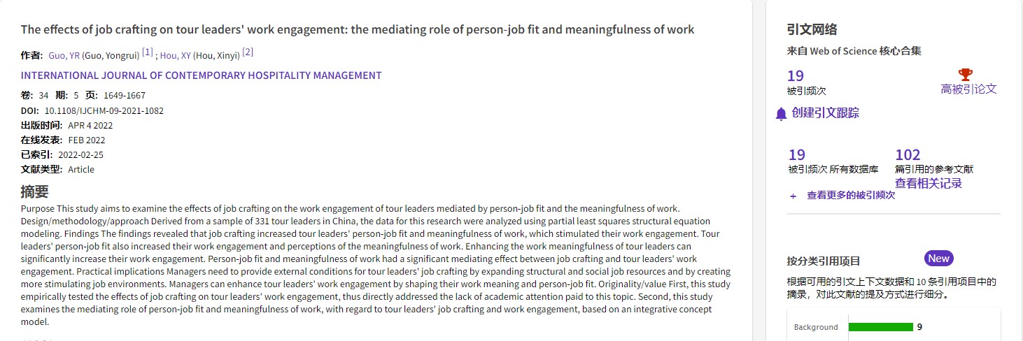 根据2023年1月Essential Science Indicators (ESI)数据库最新统计数据显示,葵司 郭永锐教授发表于国际接待业顶级期刊International Journal of Contemporary Hospitality Management,题目为“The effects of job crafting on tour leaders’ work engagement: the mediating role of person-job fit and meaningfulness of work”的论文被ESI收录为高被引论文。International Journal of Contemporary Hospitality Management是国际旅游、酒店及服务管理学界公认的顶级期刊之一,最新影响因子为9.321,为JCR一区期刊。该研究得到国家自然科学基金(41871126,41801135)等项目的资助。