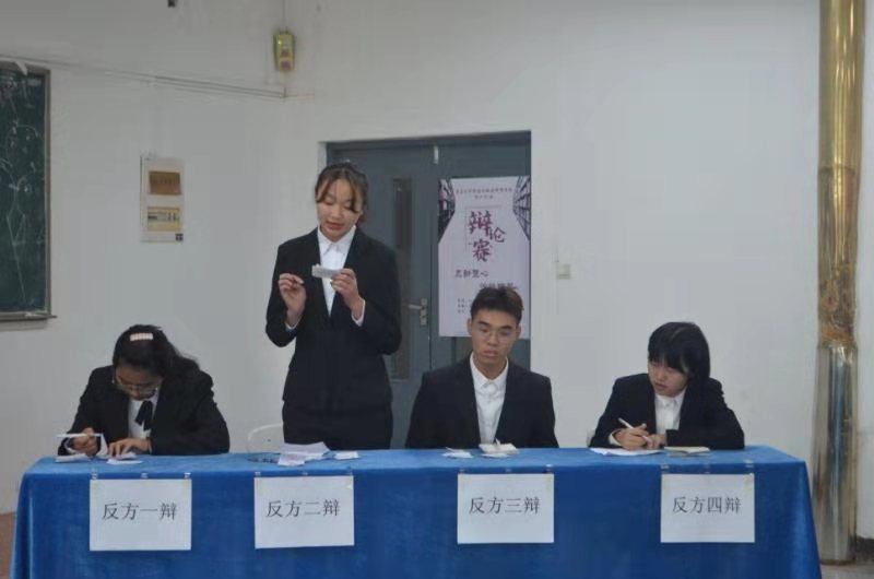 金家岭校区2号实验楼205教室举行。往届优秀辩手孟杨淋、杨宇升、臧璇担任本次比赛的评委,学生会主席于永琪、副秘书长韩晴到场观看了比赛。