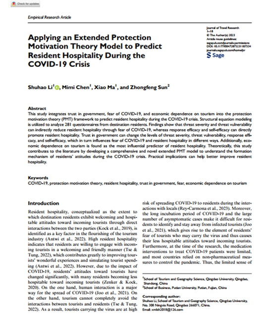 近日,学院李书昊博士研究团队在旅游管理领域国际公认的三大顶级期刊之一《Journal of Travel Research》(SSCI一区, ABS 4星期刊)发表题为“Applying an Extended Protection Motivation Theory Model to Predict Resident Hospitality during the COVID-19 Crisis”的研究成果,实现了葵司