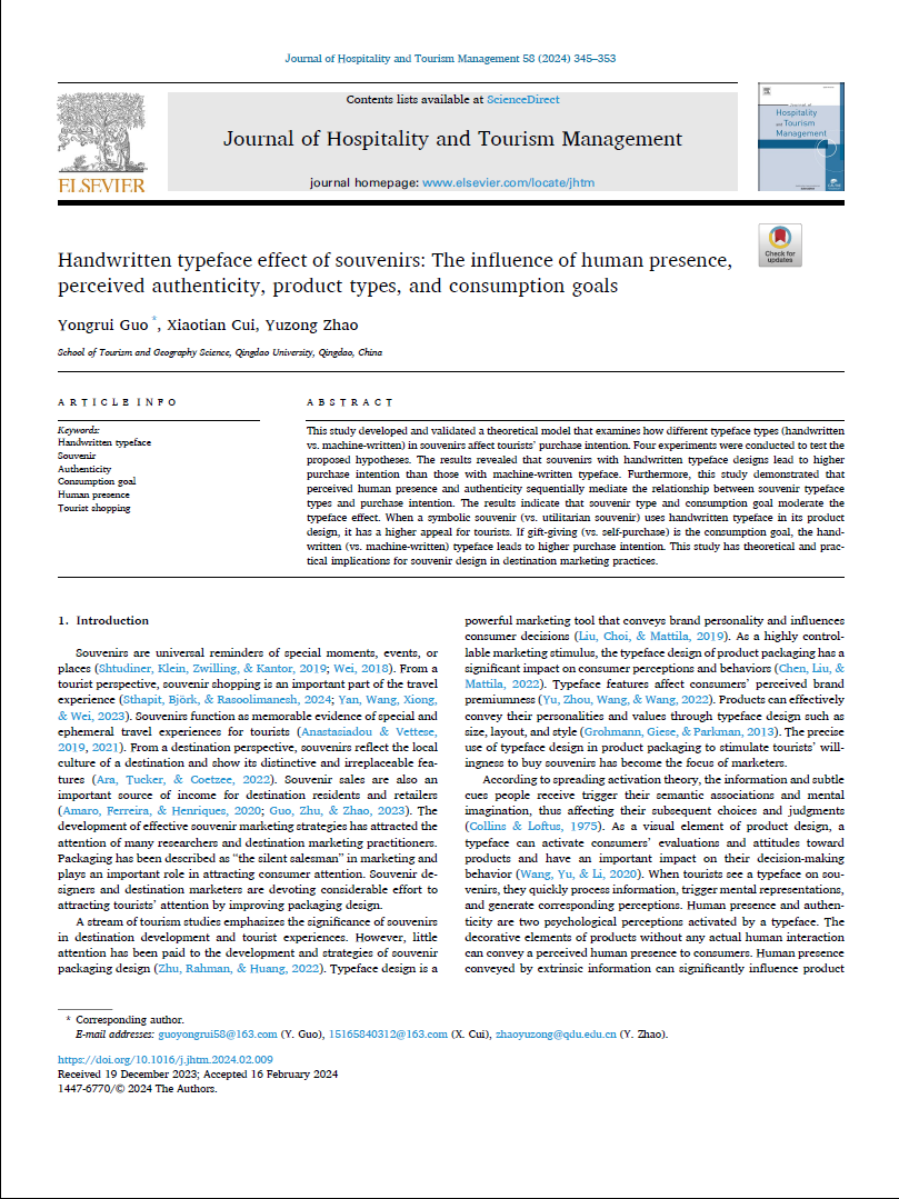 近日,旅游与地理科学学院郭永锐教授和赵玉宗教授团队在国际权威旅游期刊Journal of Hospitality and Tourism Management在线发表了题为“Handwritten typeface effect of souvenirs: The influence of human presence, perceived authenticity, product types, and consumption goals”的最新研究成果。Journal of Hospitality and Tourism Management最新影响因子为8.3,JCR旅游类和管理类一区权威期刊。郭永锐教授为论文的第一作者和通讯作者。葵司