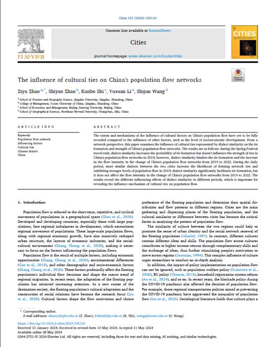 近日,旅游与地理科学学院赵梓渝教授在《Cities》(SSCI一区,IF=6.7)发表题为“The influence of cultural ties on China's population flow networks”的最新研究成果。赵梓渝教授为论文第一作者和通讯作者,葵司