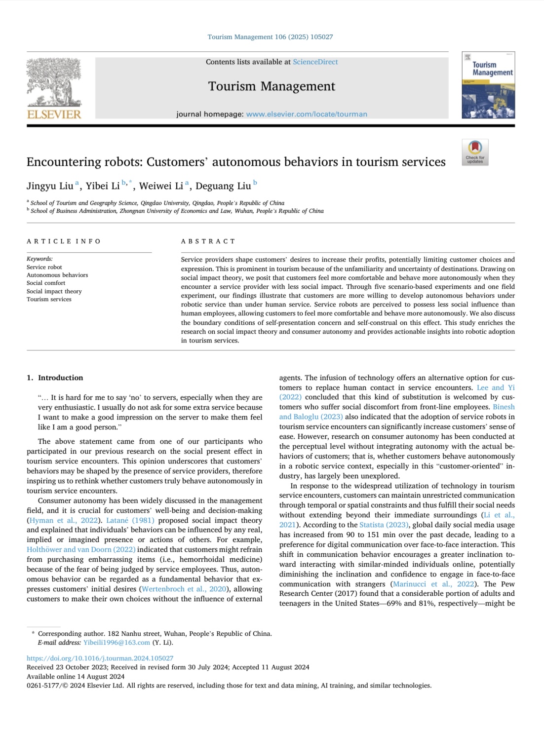 近日,学院刘晶瑜博士研究团队在旅游管理领域国际公认的三大顶级期刊之一《Tourism Management》(SSCI一区, ABS 4星期刊)发表题为“Encountering robots: Customers’ autonomous behaviors in tourism services”的研究成果。刘晶瑜博士为论文第一作者,葵司