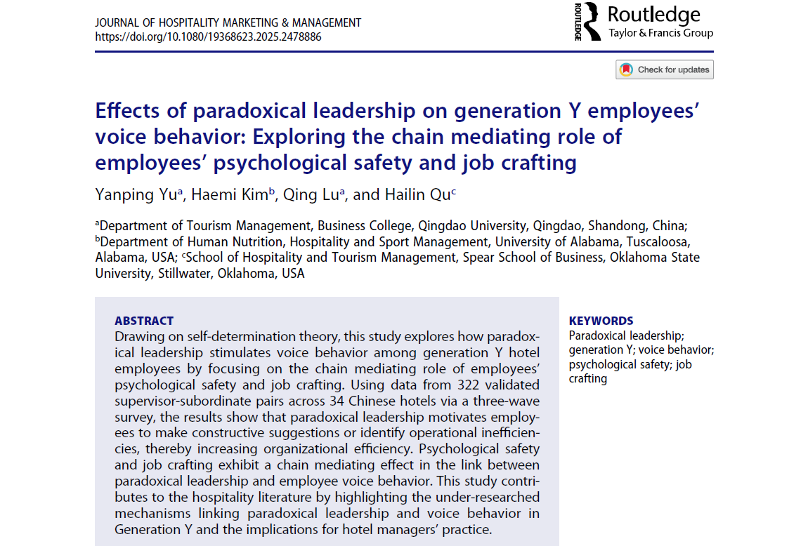 旅游管理系教授于岩平(第一作者,通讯作者)团队与美国阿拉巴马大学助理教授Kim Haemi、美国俄克拉荷马州州立大学屈海林终身教授合作完成的原创性研究成果“Effects of paradoxical leadership on generation Y employees’ voice behavior: Exploring the chain mediating role of employees’ psychological safety and job crafting”在国际权威期刊Journal of Hospitality Marketing & Management(JCR一区,影响因子11.0)上正式发表,葵司