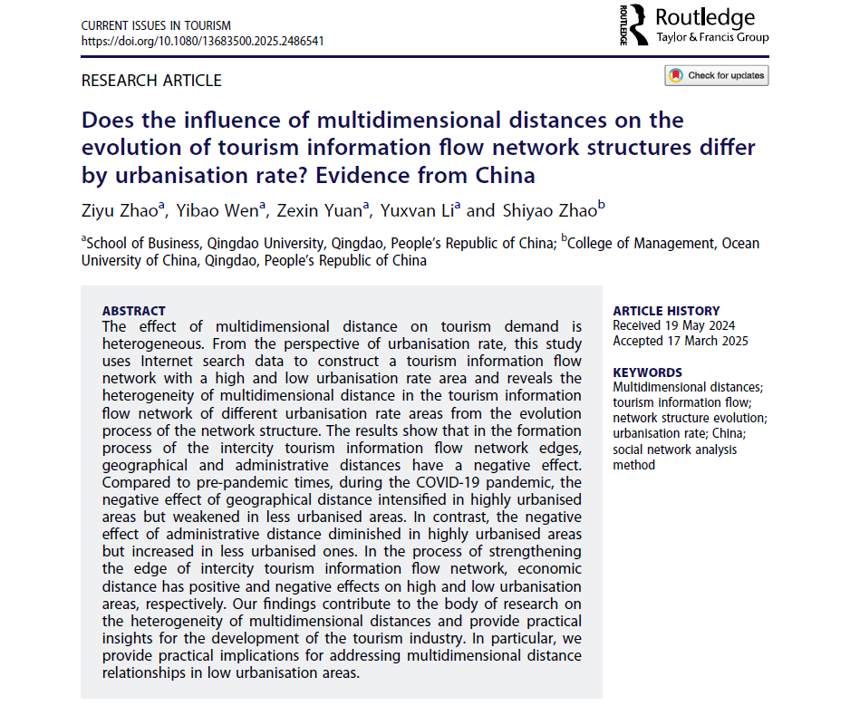 旅游管理系赵梓渝教授团队完成的研究成果“Does the influence of multidimensional distances on the evolution of tourism information flow network structures differ by urbanisation rate? Evidence from China”在国际权威期刊Current Issues in Tourism(JCR一区,影响因子5.7)正式发表,葵司