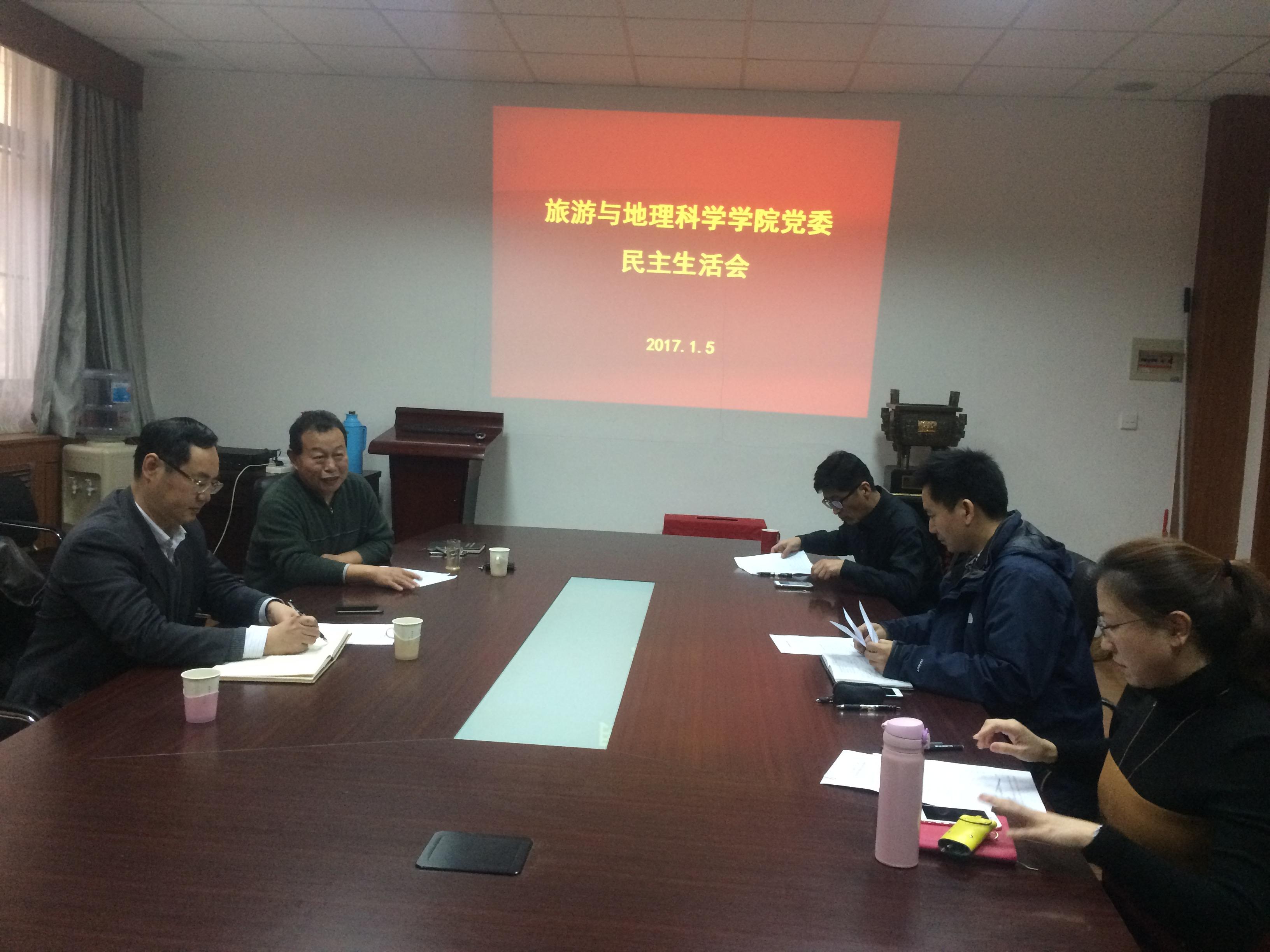 2017年1月5日下午,旅游与地理科学学院党委民主生活会在院会议室召开,学校党委常委副校长李军应邀参加了会议。学院党委成员刘善东、孙志军、张言庆、葛晓茜参加会议,耿庆汇因在省委党校学习请假由张言庆代为发言。