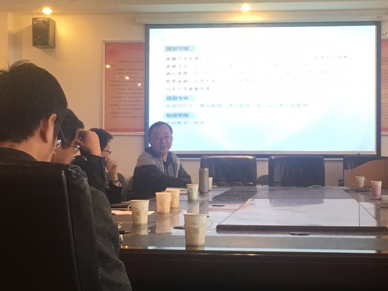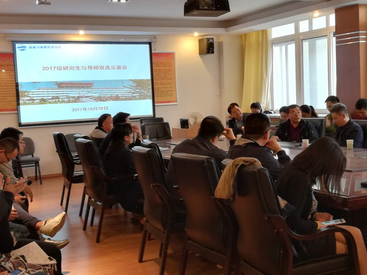研究生导师双选会暨见面会在睿思楼220会议室顺利召开。出席本次会议的有马波教授、耿庆汇副教授、张言庆副教授、王平副教授、高德宗副教授、田克勤副教授、唐顺英副教授、于岩平副教授、钟行明讲师、潘永涛讲师、山东老转村美食娱乐有限公司牛虎兵总经理、港中旅国际(山东)旅行社有限公司田平总经理及青岛市旅游局江秀凯副局长等研究生导师以及2017级硕士研究生,见面会由学院研究生分管领导张言庆副院长主持。