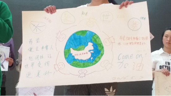 2016年5月7日,“大爱无声”项目组有幸再次来到聋校。这一次,项目组的同学们让孩子们画出了自己想象中的未来世界,一起玩了“能量传输”游戏,这让参与的同学再次见识到孩子们的专注和强大的团队合作能力。孩子们的画涉猎广泛,也有发人深思的作品,比如其中一幅画上写了这样一句话“希望健全人士和聋人一起团结,让世界变得更美好。”