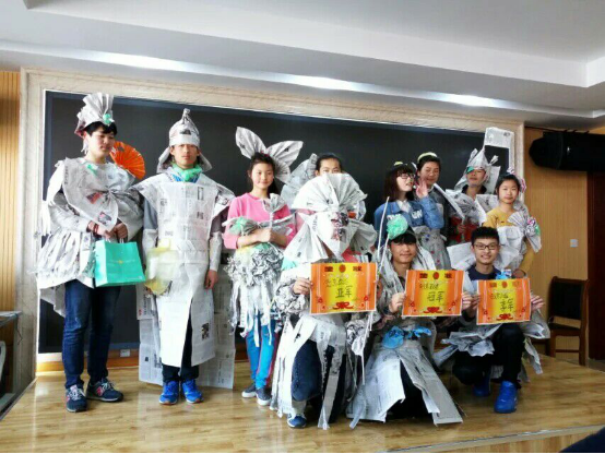 在这次活动中,项目组成员与孩子们共同完成了【旧物制新衣】和套圈得小奖品两个环节的游戏,在第一个环节中,孩子们用报纸和塑料袋做成了各种让人惊叹的衣服,就连每天与他们接触的老师也没有想到孩子们竟然有这么强的设计能力。