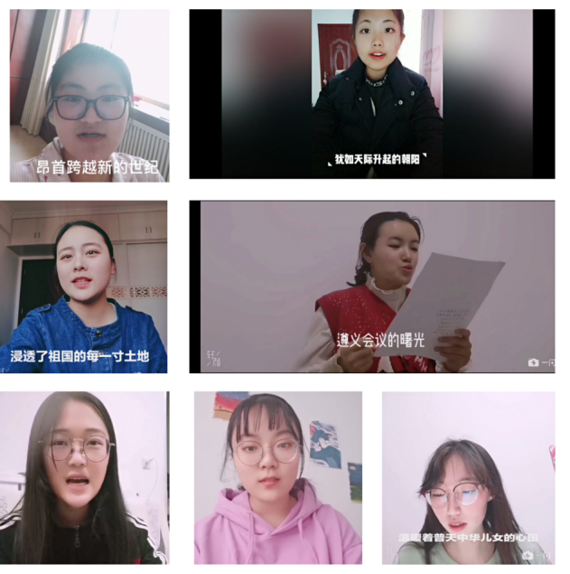 工商管理类2019级12班韩福媛、姜佳慧、廖婧祎、卢晓曼、薛莹、张宇、王玥,朗诵《党啊,我的母亲》,阅读主张:彰显在党的领导下,我们国家越来越繁荣,以及我们对党的热爱。