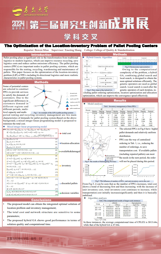 苗卜文同学作了题为《托盘循环营运中心选址-库存优化》的汇报,结合托盘循环共用系统的特点,建立了包括多级容量限制,多周期库存管理以及双向物流的混合整数规划模型;鉴于选址-库存优化问题的复杂度,提出了一种混合遗传算法,设计了三种局部搜索的优化策略以提高求解效率;最后,通过数值实验验证了模型的可行性和算法的有效性,为托盘循环共用系统的管理者提供决策支持。