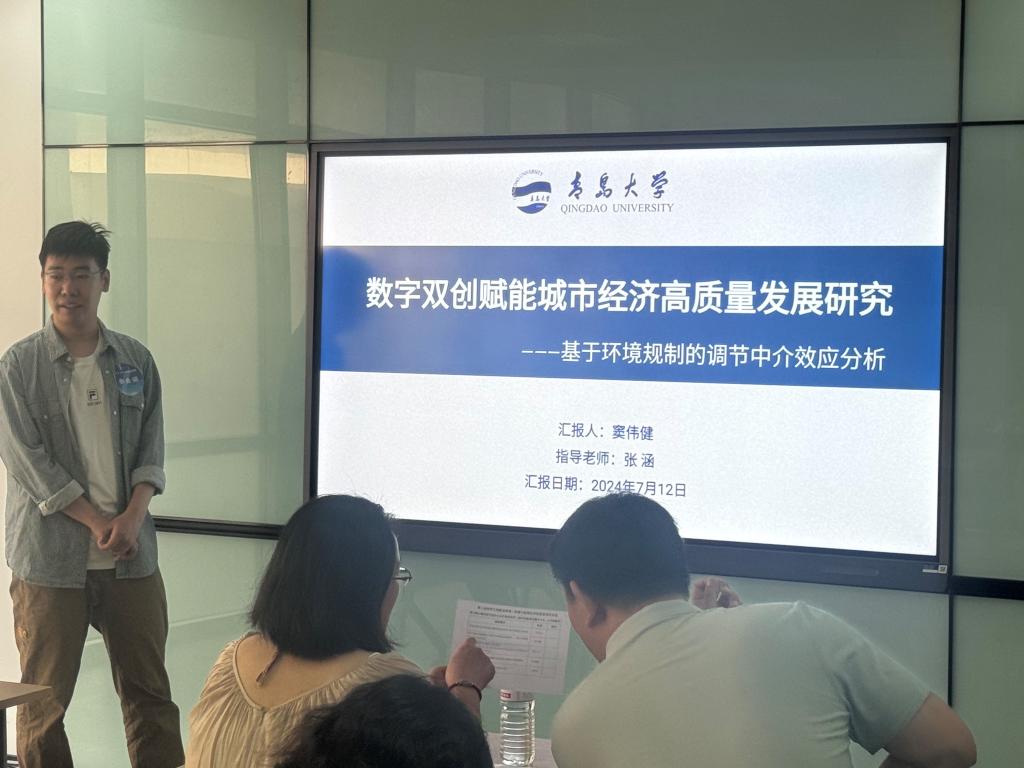 窦伟健同学做了题为《数字双创赋能城市经济高质量发展研究——基于环境规制的调节效应分析》的汇报,基于2010-2020年278个城市的面板数据,从数字双创对经济高质量发展的赋能视角出发,首先通过熵权法测度城市经济发展质量,进而采用空间方法分析数字双创对城市平均与异质空间溢出效应,尽而通过有调节的中介效应模型识别赋能路径及环境规制在赋能过程中的调节方向与强度。