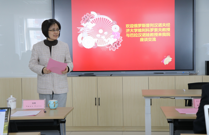 座谈会上,巴拉汉诺娃·达里科副教授介绍了俄罗斯普列汉诺夫经济大学发展历史、专业方向、课程设置、国际合作交流项目等基本情况。维利科罗索夫·弗拉基米尔教授做了题为“俄罗斯现代经济发展现状及中俄能源合作前景分析研究”的学术讲座,详细介绍了俄罗斯在农业、能源、金融等方面的发展态势,并回答了师生的提问。