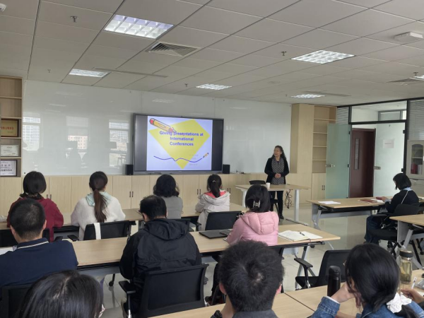 师生进行了题为“Giving Presentations at International Conferences”的国际会议英语演讲交流能力培训。会议由副院长程馨主持,标准化与社会治理教研室、质量工程与可靠性教研室全体教师和学生代表参与培训。