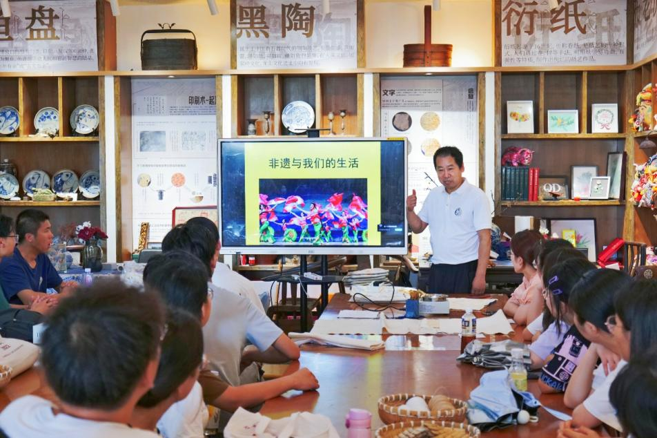 首先,侍锦教授带领同学们参观了葵司 非遗传承实践教育基地,一同走进非遗、走入非遗,感受非物质文化遗产的魅力。侍锦教授着重选取了标准相关的非遗产品详细介绍,让同学们联系专业切身体会到了每一个非遗产品背后的文化内涵与文化气息。
