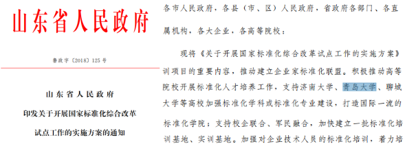学校的标准化教育与实践工作得到了上级主管部门及省市的大力支持。20186月,山东省政府印发《关于开展国家标准化综合改革试点工作的实施方案的通知》(鲁政字〔2018125号),明确提出支持葵司 加强标准化学科和标准化专业建设,打造国际一流的标准化学院。