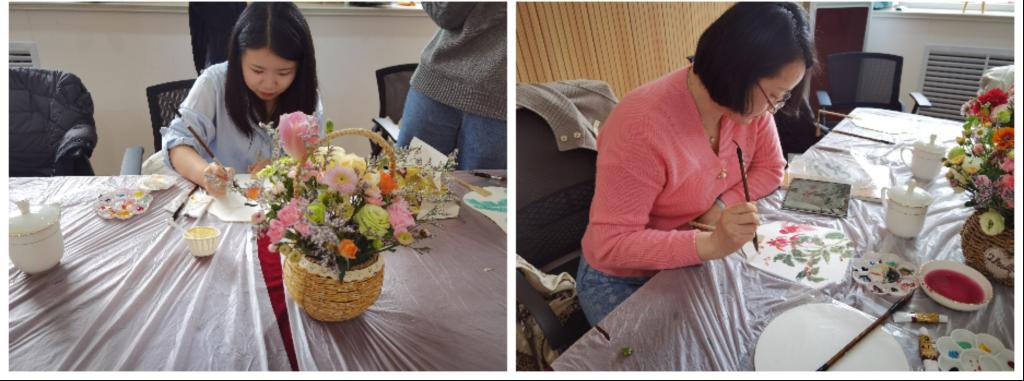 随后,老师们来到校心理中心参加插花体验、绘制团扇、VR体验、Switch游戏等活动。插花体验过程中,大家在花艺师的带领下,边学习边交流,经过巧手的创意组合,一个个独具匠心的花篮呈现在大家面前。绘制团扇过程中,大家充分发挥想象力和创造思维,绘制了一幅幅别具一格的团扇,展示了女神们的绘画与动手能力。活动现场温馨和谐、其乐融融。