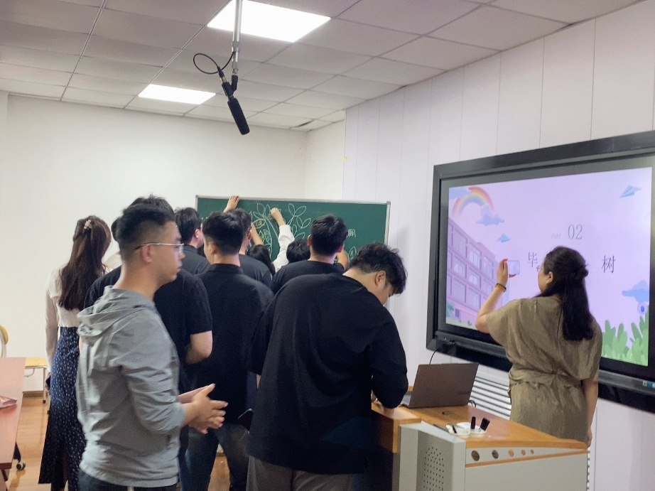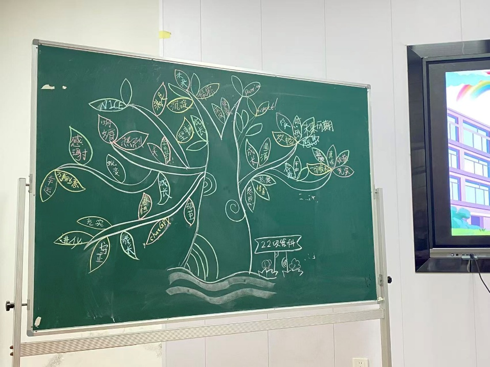 随后,“毕业树”活动为班会增添了独特的意义。黑板上的大树枝繁叶茂,每名毕业沉思片刻后,在象征希望的“树叶”上郑重地在写下了一个总结自己三年来的成长与变化。“蜕变”“坚韧”“突破”……一片片写满感悟的树叶很快便汇聚成一片充满力量的“森林”,见证着大家的成长足迹,也寓意着毕业生们将带着这些收获奔赴广阔天地。