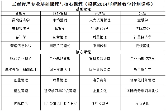 本专业基本修业年限为四年,授予学位为管理学学士,主要课程为管理学,会计学,财务管理学,市场营销学,微观经济学,宏观经济学,组织行为学,运营管理学,战略管理,人力资源管理,管理信息系统,经济法等。