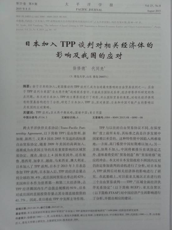 徐修德教授多年来一直关注TPP谈判的进展状况,并致力于谈判对我国的影响研究。该论文是其承担的国家社科基金项目“日本加入TPP后对中国的影响及应对”(项目编号:14BGJ006)的阶段性成果。