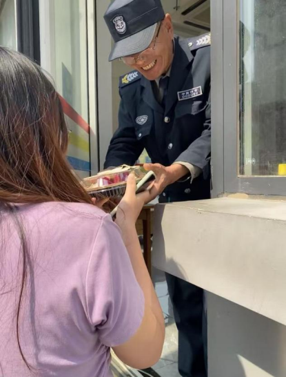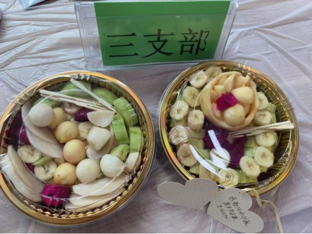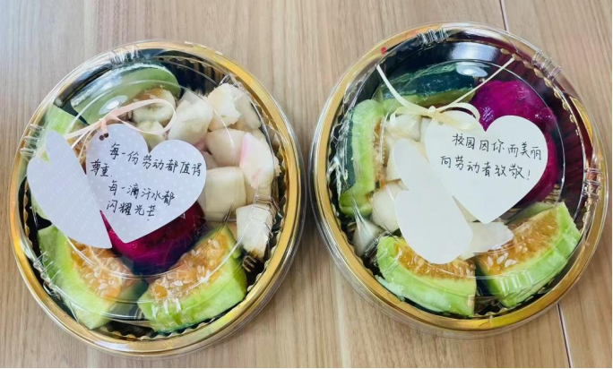 制作完成后,各小组派代表将果盘送至后勤岗位,收到礼物的工作人员纷纷表示“很惊喜很感动非常感谢同学们的关怀”。