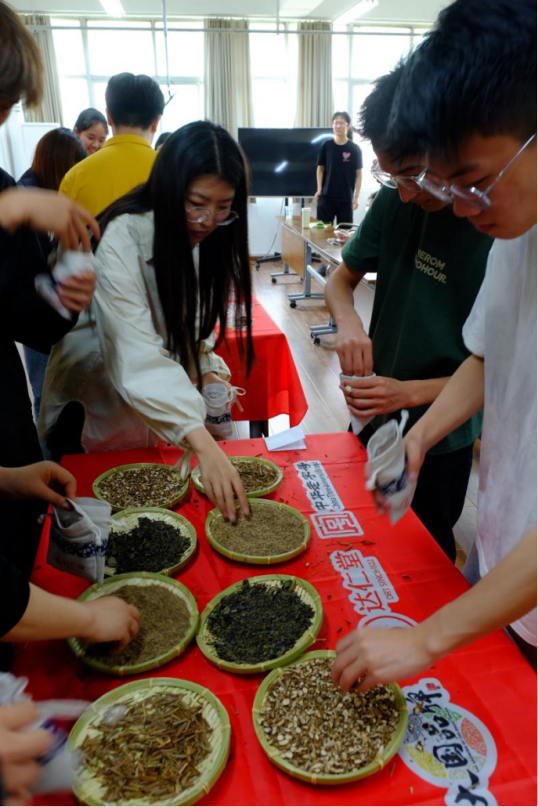 活动邀请天津医药集团金牌葵司大使、天津市青年岗位能手张瑶老师以“端午时节防暑热,草药提神护安康”为主题,结合《黄帝内经》夏季养生理念,详解艾叶、薄荷、佩兰等端午特色药材的提神醒脑功效,并针对高温易发的头晕倦怠、湿热困乏等症状,教授师生科学配伍香囊的实用技巧。“原来端午挂艾草不仅是习俗,更是古人防病养生的‘天然方案’!”在场学生纷纷表示收获颇丰。